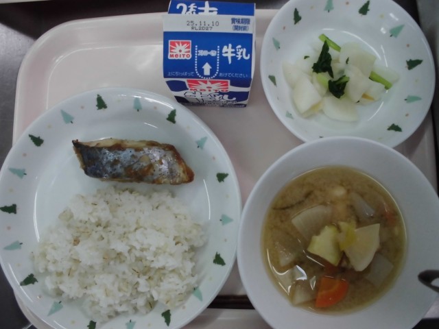 麦ごはん 牛乳 さわらの香味焼き さつま汁 かぶの香りづけ