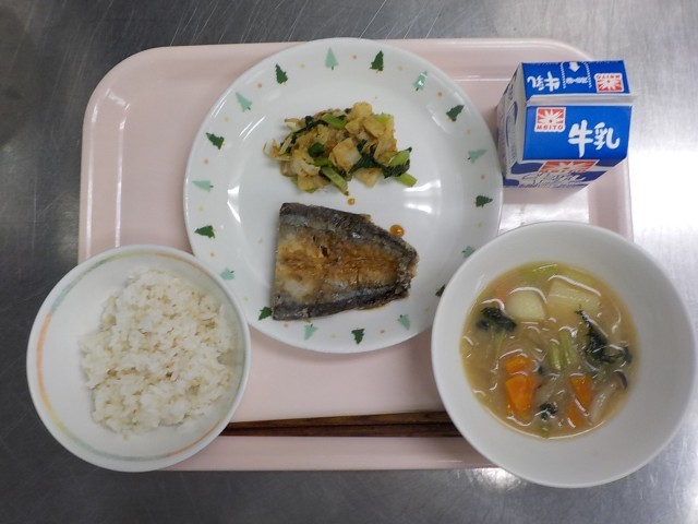 牛乳、麦ごはん、サンマのかば焼き、はくさいのおひたし、野菜の味噌汁