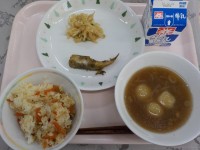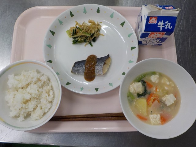 牛乳、麦ごはん、さわらのごま味噌かけ、もやしと小松菜のからし醤油、呉汁