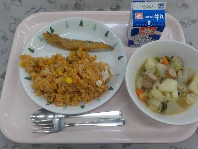 牛乳、チキンライス、ししゃもフライ、ポトフ