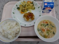 牛乳、ビスキュイパン、ブロッコリーのサラダ、ミネストローネ