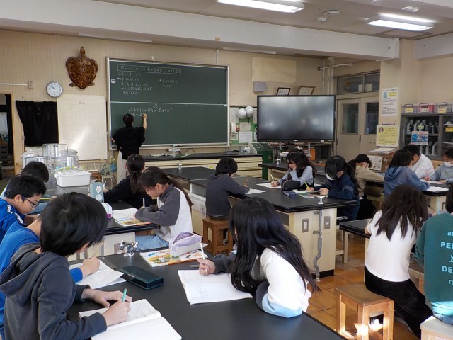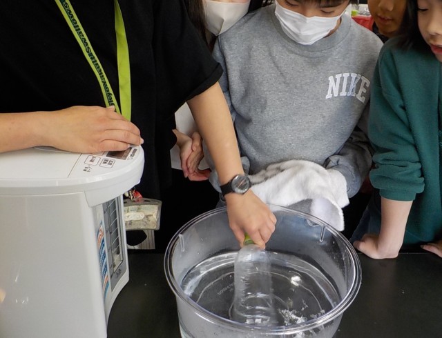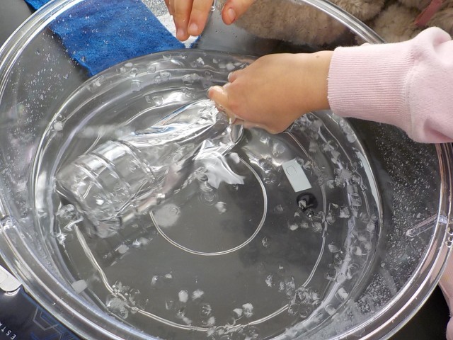 ぺットボトルのふたを閉めて氷水に入れたら、へこみました。お湯に入れたら、元に戻りました。なぜでしょう?空気は温められると上に行くことは体験で知っています。空気の体積が温度で変化することには、気づいていないようです。子供たちは疑問をもち、予想を立て、課題を解決していきます。