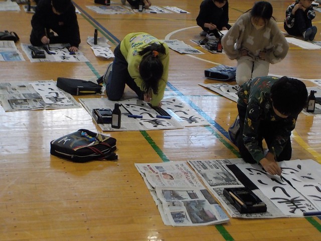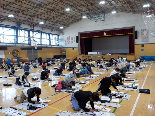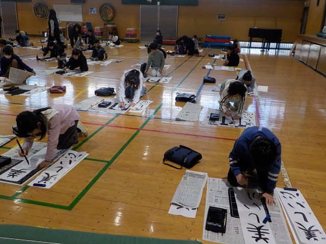 2学期中に書き初めの練習をしてから、冬休みの宿題ではなく、家庭で練習したい人は紙を持ち帰ります。4年生は、体育館で「美しい心」を書いていました。