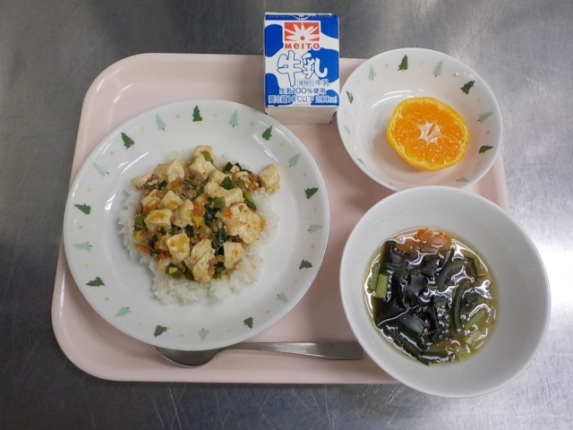 1月14日(水) 公開日 2026/01/15 更新日 2026/01/15 今日の給食 牛乳、麻婆ライス、わかめスープ、菊花みかん麻婆豆腐は中国の豆腐料理です。少しピリ辛の味付けなので、ご飯が進みます。「産地公表」北海道:玉ねぎ 青森県:ニンニク 群馬県:豚ひき肉 茨城県:ニラ埼玉県:小松菜 千葉県:人参・長ネギ 高知県:しょうが 熊本県:みかん