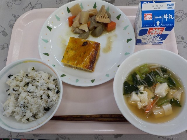 牛乳、わかめごはん、親子焼き、筑前煮、えのき入りすまし汁