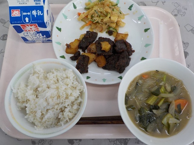 牛乳、麦ごはん、くじらの東煮、糸寒天のごま酢あえ、野菜のみそ汁