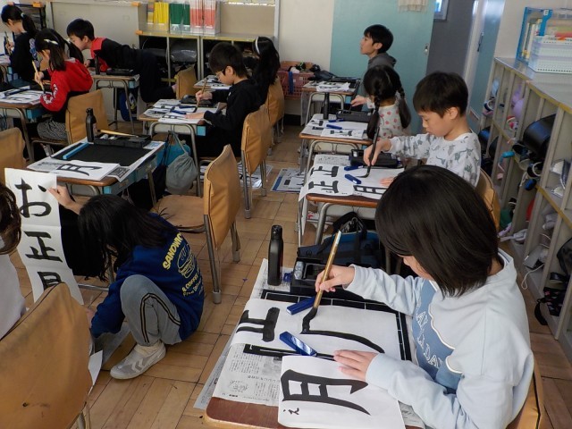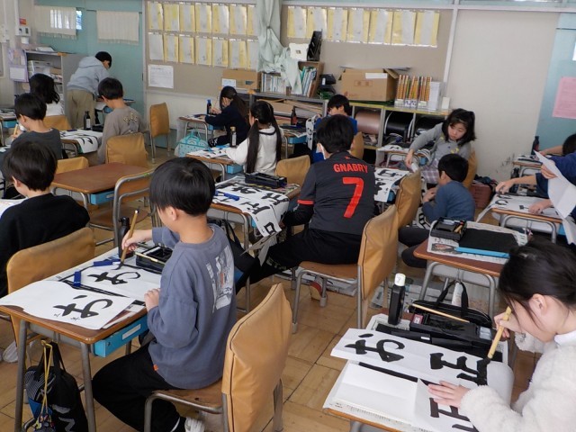 1・2年生は硬筆、3~6年生は毛筆で行います。3年生は初めての縦長の紙での書き初めです。先生の手本をしっかり見て、大きくていねいに、気持ちを込めて書きました。