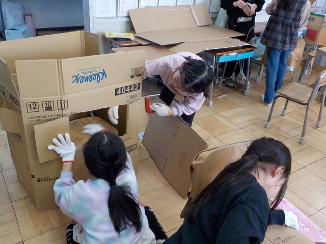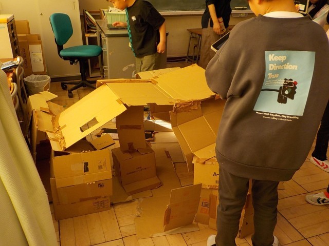 段ボールカッターの安全な使い方を教わり、協力して基地や家を作りました。つなぎ方を相談しながら工夫して作り、大きな作品が出来上がって、中に入ったりタブレットで写真を撮ったりとても楽しそうでした。