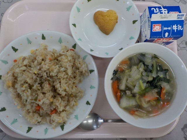 牛乳、もやしチャーハン、白菜スープ、ガマくんのクッキー