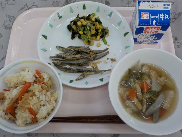 牛乳、きつねごはん、きびなごのからあげ、小松菜の磯和え、冬野菜汁