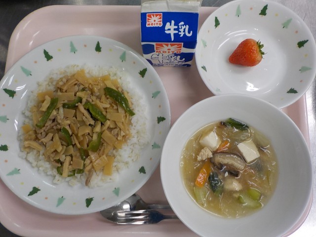 牛乳、青椒肉絲丼、春雨スープ、いちご