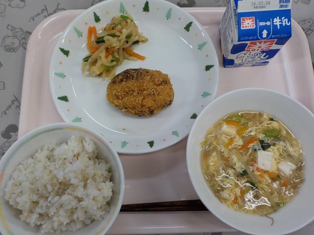 3月2日(月) 公開日 2026/03/02 更新日 2026/03/02 今日の給食 牛乳、麦ごはん、肉じゃがコロッケ、大根サラダ、むらくも汁コロッケといえば、どんなコロッケが好みですか?ポテトコロッケ、カボチャコロッケ、クリームコロッケなど色々ありますね。今日は、肉じゃがいもをコロッケの具にした「肉じゃがコロッケ」です。