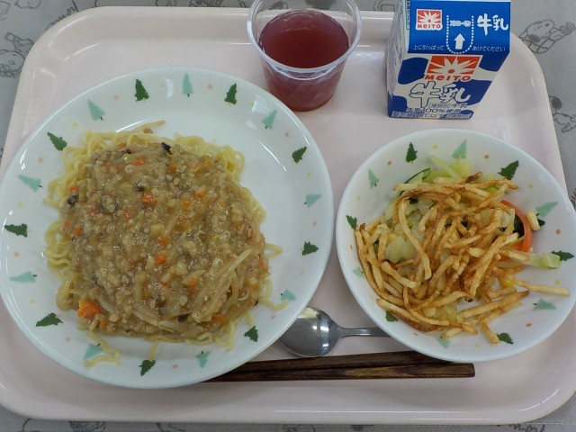牛乳、ジャージャー麺、サウピカンサラダ、キラキラグレープゼリー