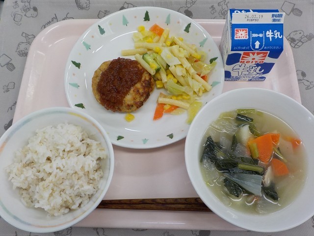 牛乳、麦ごはん、ハンバーグ、マカロニサラダ、じゃが芋とベーコンのスープ