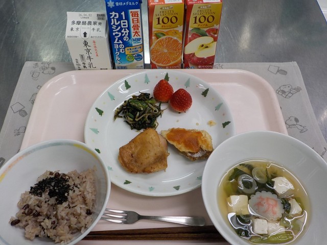 牛乳、リザーブ飲み物、赤飯、鶏肉の香味焼き、ぶりの梅がらめ、ホウレンソウとモヤシの磯あえ、豆腐のすまし汁,いちご