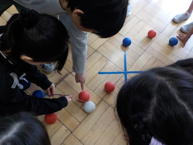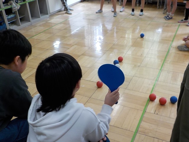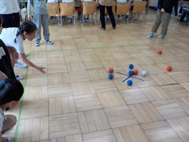 総合で福祉を学んできた4年生は、3年生にボッチャを伝えました。3年生は4年生に教わって、ボッチャ体験を楽しみました。