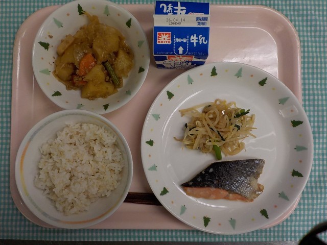 麦ごはん 牛乳 鮭の塩麹焼き 新じゃが芋のそぼろ煮 もやしと小松菜の甘じょうゆ