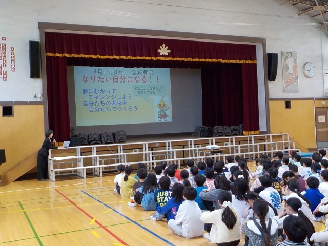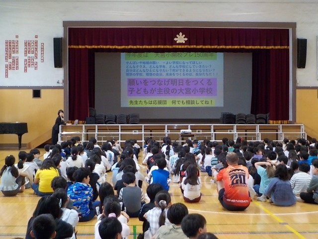 始業式から1週間が経ち、2~6年生と一緒に全校朝会を行いました。子どもたちの話の聞き方に集中力があり、新しいクラスで新しい気持ちでがんばろうとする意欲をとても感じました。「なりたい自分になる!」ためには、大宮小の目標「考える子 助け合う子 つよい子」がチャレンジするときに大事な力になります。「願いをつなげて明日をつくる 子どもが主役の大宮小学校」、先生たちは子どもたちの応援団です。