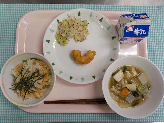 たけのこごはん 牛乳 いかのかりん揚げ けんちん汁 ゆかりきゃべつ