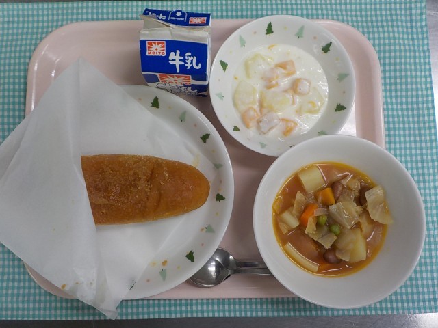 きなこ揚げパン 牛乳 ミネストローネ フルーツのヨーグルトかけ