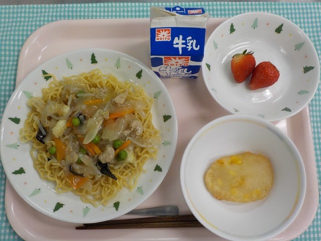 令和8年4月27日(月) 公開日 2026/04/28 更新日 2026/04/28 今日の給食 五目あんかけ焼きそば 牛乳 じゃがいももち いちご【産地公表】にんにく:青森県 しょうが:高知県 豚肩肉:群馬県 にんじん:徳島県 たまねぎ:北海道 たけのこ(缶):福岡県、熊本県 もやし:栃木県 いか:ペルー あさり(むき身):中国 じゃがいも:鹿児島県 いちご:栃木県