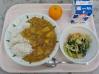 牛乳、カレーライス、じゃこサラダ、みかん大宮小学校のカレーライスは、玉ねぎをじっ...
