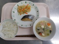 牛乳、さわらの幽庵焼き、しゃきしゃき和え、豚汁給食で良く使われる青菜の1つにアブ...