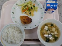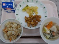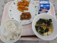 牛乳、わかめご飯、ポテトコロッケ、もやしと小松菜の甘醤油、かきたま汁かきたま汁は...