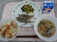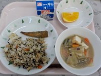 牛乳、切り干しごはん、大豆といかの甘辛揚げ、白菜の辛子酢あえ、塩豚汁「切り干し」...