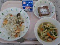 牛乳、もやしチャーハン、白菜スープ、ガマくんのクッキー2月9日~20日は大宮小学...
