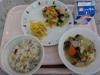 牛乳、大豆入りドライカレー、野菜のレモン酢かけ、アップルゼリー今日の大豆入りドラ...