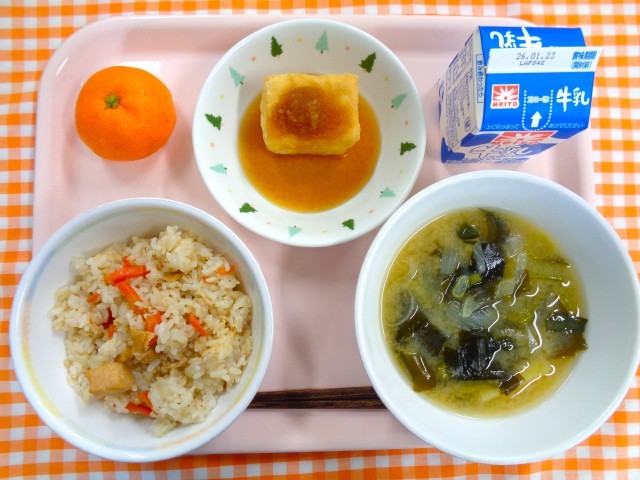 きつねごはん、揚げだし豆腐、じゃがいものみそ汁、みかん、牛乳