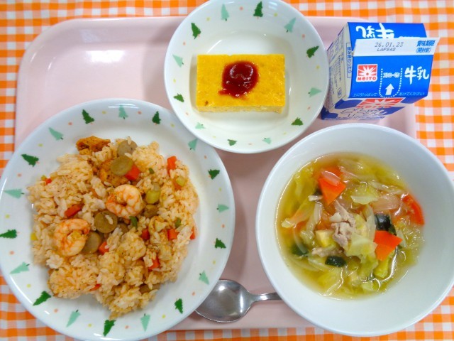 ジャンバラヤ、チーズオムレツ、野菜スープ、牛乳
