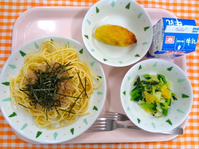 おろしスパゲティ、小松菜のはっさくサラダ、スイートポテト、牛乳