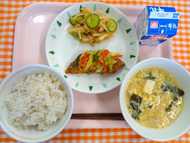 麦ごはん、揚げしいらの五目あんかけ、かきたま汁、大根のツナサラダ、牛乳