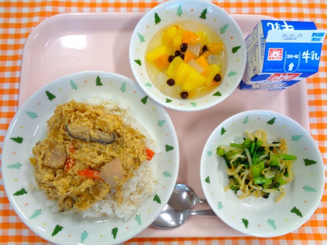 親子丼、もやしと小松菜の辛子醤油あえ、フルーツみつ豆、牛乳