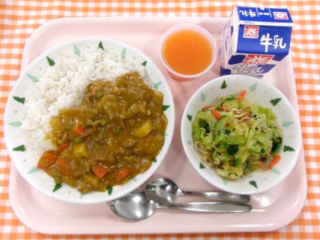 カレーライス、じゃこサラダ、キャロットゼリー、牛乳