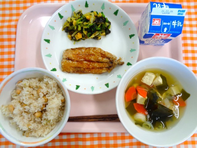 大豆入りじゃこごはん、いわしの揚げひたし、豆腐とわかめのすまし汁、いそ和え、牛乳