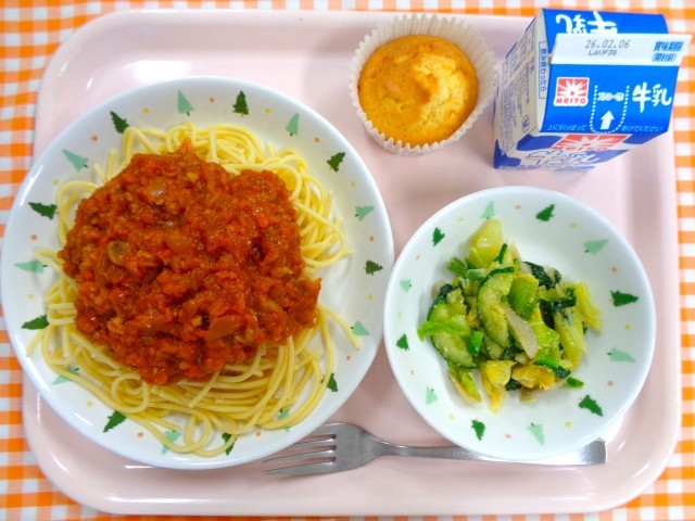 スパゲティミートソース、ごぼうサラダ、泉南カップケーキ、牛乳