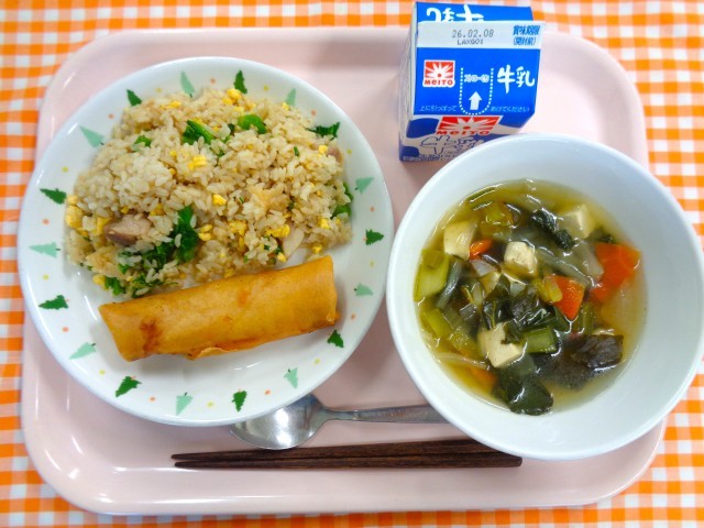 菜の花チャーハン、魚の包み揚げ、わかめスープ、牛乳