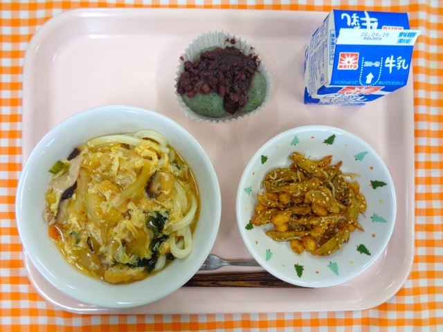 筍ごはん、いかのかりん揚げ、沢煮椀、米粉抹茶ケーキ、牛乳