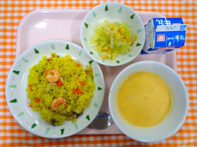たまごあんかけチャーハン、わかめスープ、さつま芋パイ、牛乳