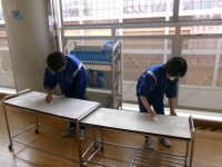 「不審者侵入時の対応」を設定し、教員はさすまたを使って不審者を取り押さえる想定練習を、生徒たちは各教室のドア周辺に机や椅子を密集させてバリケードを作り訓練を行いました。
