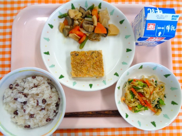 あずきごはん、松風焼き、五色煮、野菜のごまあえ、牛乳