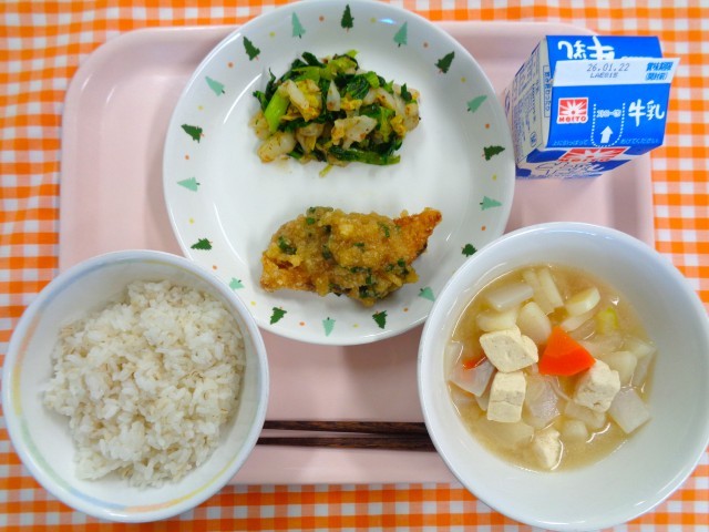 1月16日(金)の給食 公開日 2026/01/16 更新日 2026/01/16 泉南中学校の給食 麦ごはん、揚げぶりのみぞれ煮 根菜汁、白菜と小松菜のおかか和え、牛乳今日は杉並区内の農家さんからいただいた大根を使って『揚げぶりのみぞれ煮』と『根菜汁』を、小松菜を使って『白菜と小松菜のおかか和え』を提供しました。地元野菜のおいしさを、子どもたちに感じてもらえる給食になりました。