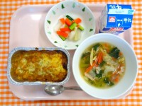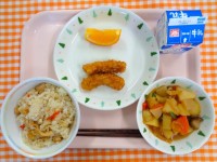 麦ごはん、さわらの西京焼き、じゃがいものそぼろ煮、シャキシャキ和え、牛乳