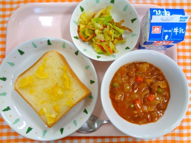 カレーライス、じゃこサラダ、キャロットゼリー、牛乳
