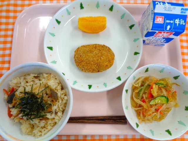 きつねごはん、揚げだし豆腐、じゃがいものみそ汁、みかん、牛乳