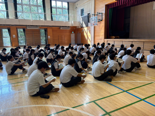 8日6校時にアリーナにて、修学旅行のしおり読み合わせを行いました。