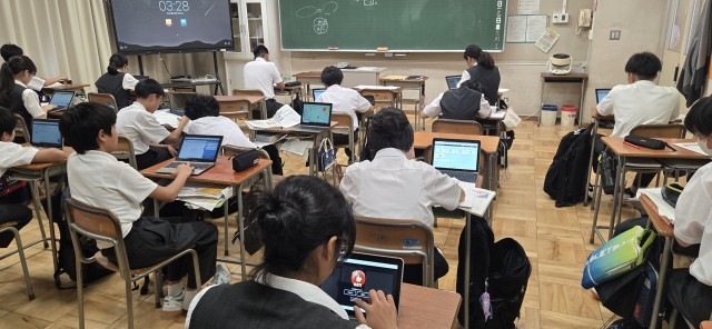 16日から18日までの期間、来週行われる中間考査に向けて、6時間目終了後の20分間、自習を行っています。タブレット端末や問題集など、各自のペースに合わせて学習を進めています。